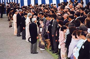 天皇皇后両陛下は,衆・参両院の議長・副議長・議員,内閣総理大臣,国務大臣,最高裁判所長官・判事,その他の認証官など立法・行政・司法各機関の要人,都道府県の知事・議会議長,市町村の長・議会議長,各界功績者とそれぞれの配偶者約2,000人をお招きになって,親しくお話しになっています。