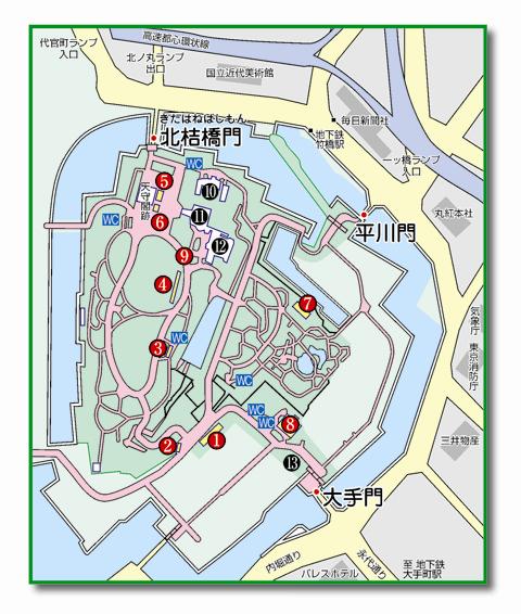 ⑩書陵部庁舎,⑪桃華楽堂,⑫楽部庁舎,⑬皇居東御苑管理事務所では展示はありません。