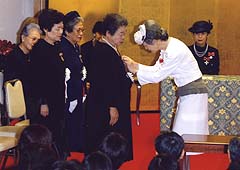 第39回フローレンス・ナイチンゲール記章授与式で記章を受章者の胸におつけになる皇后陛下(日本赤十字社)