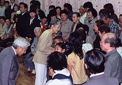 町営住宅のぞみ団地(桜ヶ丘保育所)をご訪問になり,被災住民に声をおかけになる天皇皇后両陛下(虻田町)
