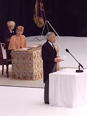 戦傷病者特別援護法制定40周年並びに財団法人日本傷痍軍人会創立50周年記念式典でおことばを述べられる天皇陛下(日本武道館)