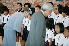 奄美パークで,島唄を披露した小学生に声をおかけになる天皇皇后両陛下(笠利町)