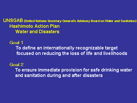 “Water and disasters” is identified as one of the high priority issues in the Hashimoto Action Plan put together under the guidance of the United Nations Secretary General’s Advisory Board on Water and Sanitation (UNSGAB). As many of you know, the chapter on water and disasters in the Action Plan has two goals: the first is to establish a clear-cut target that articulates the direction of global actions for reducing the loss of life and livelihood caused by water-related disasters, and the second is to provide adequate safe drinking water and sanitation during and after disasters (Figure 1).