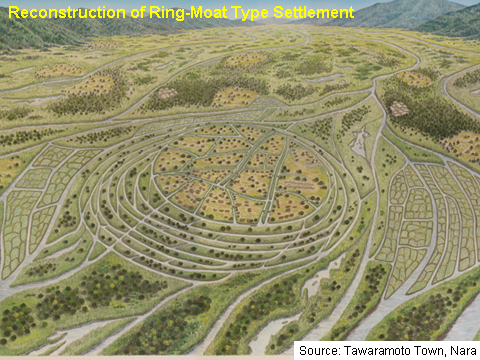 Please look at this photograph (Figure 2). This was where the ring-moat settlements of the Karako and Kagi ruins were discovered in Nara, the ancient capital of Japan. The settlement was surrounded by multiple ring-shaped moats, the bigger ones over eight meters wide. This picture shows a reconstruction of the settlement according to an investigative excavation. At its height of expansion, it is known that it covered as much as forty-two hectares (Figure 3).