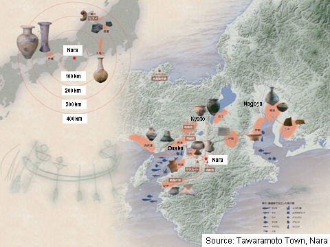It is believed that at the latest, by the 6th to 4th century B.C., an advanced form of rice-paddy cultivation was established in Japan. As the rice-paddy farming brought over from the Eurasian continent expanded northwards, the farming lifestyle took root from the earlier livelihood of fruit gathering, fishing and hunting. This agricultural culture called the Yayoi culture produced popularly used Yayoi ware and it was at this time that the use of iron and bronze ware began (Figure 4). The Yayoi period lasted until the 3rd century A.D.