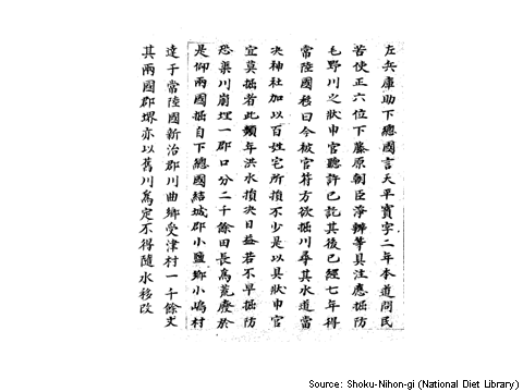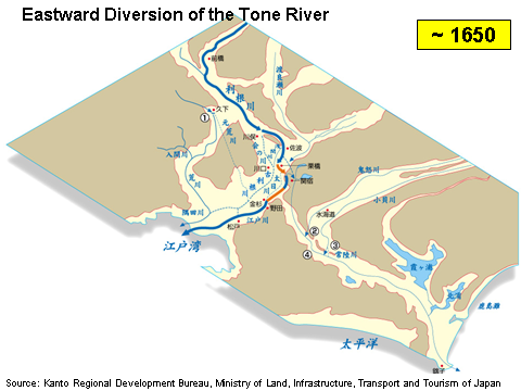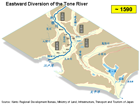 River works were carried out from time to time on the Tone and Hitachi rivers. The mammoth project was the eastward diversion of the Tone River completed in modern times.