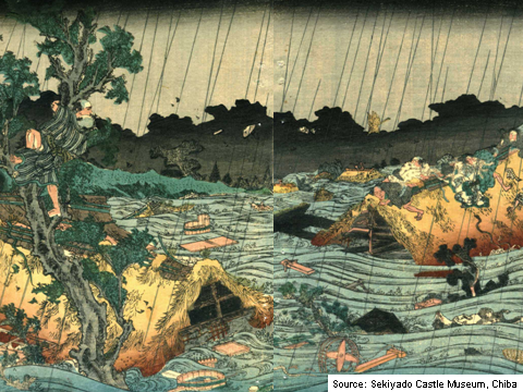 This does not mean that people were entirely free from flood damage after the completion of the work of diverting the Tone River. Including smaller ones, there were altogether 173 floods during the 265 years of the Edo period, with major occurrences about every forty years. When big floods started upstream, the floodwater would surge down the old riverbed into Edo, causing huge damage (Figure 12). The Tone River was terribly difficult to control requiring sustained efforts to improve safety.