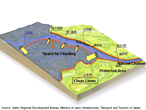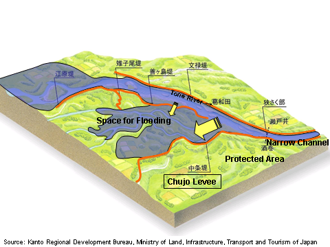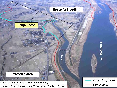 Discontinuation of the flood abating role of the Chujo Levee, as expected, had a large impact on the Tone River flood control system. After numerous discussions, it was decided to continue projects to increase the safety of the whole Tone basin. Today, in addition to the basic approach to ensure the integrity of the whole levee, water is detained in upstream dams as well as in retarding basins in the lower reaches of the Tone River to complement the flood containing capacity of the river in the event of a large-scale flood.