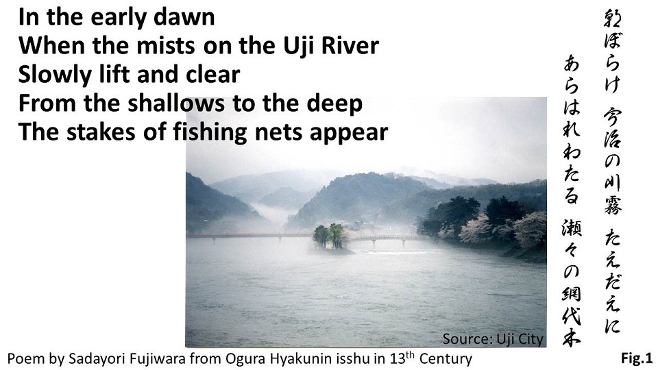 This Waka poem is in “Ogura Hyakunin Isshu” from the early 13th Century , a compilation of one hundred works composed by eminent poets. The poem depicts delicately the beautiful morning on the Uji River near Kyoto (Fig.1). Wood stakes for fishing nets that gradually appear in the scene symbolize the harmony between people’s livelihoods and nature.