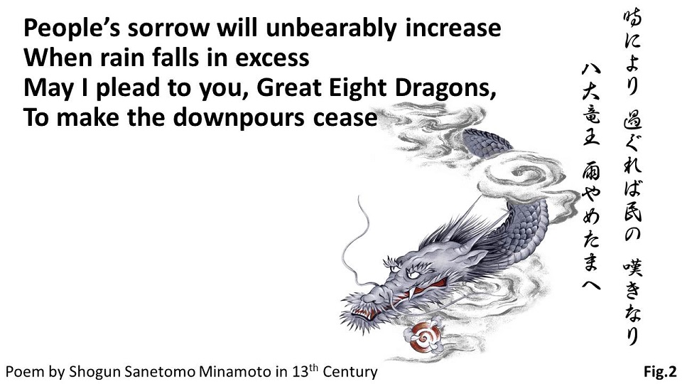 This poem by Sanetomo Minamoto, a Shogun in the Kamakura Period, in “Kinkaiwaka-shu” is referred to as “I composed the poem after having prayed to the Buddha Statue in July, 1211 when flooding immersed the world (the land), and the people deplored the tragedy.” Flooding brought such a great sorrow to the people that the Shogun Minamoto himself pleaded with the Great Eight Dragons, Gods of Water, to cease the downpour (Fig.2).