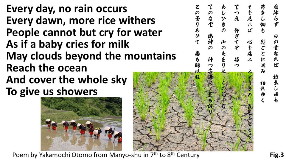 Droughts also bring grave calamity to the people. Yakamochi Ohtomo deplores in verses of his poem which was incerted into the Manyo-shu, the oldest anthology edited between the 7th and the 8th centuries (Fig.3). Let me quote: