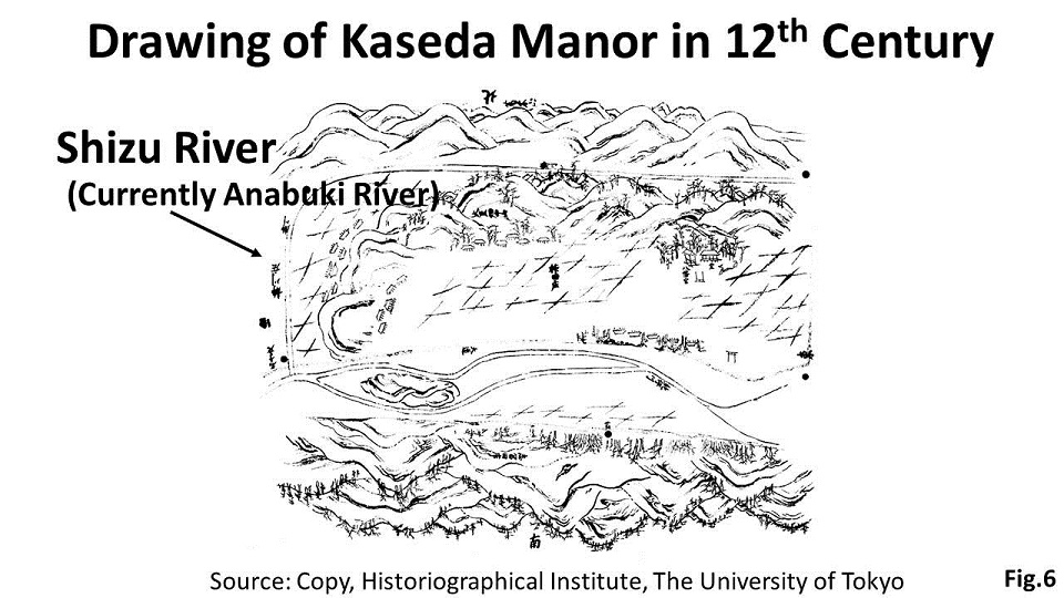 This is a map of the Kaseda Manor (Fig.6). The Manor was established in the Kiinokuni region in the late 12th Century. The map is well-known as it clearly shows the typical composition of a manor in the period. You can see the Shizu River running from east to west and turning its course to the south to join the Kinokawa River, the main stream. You can also see paddy fields in the center, temples in the upper right, and communities in the left and along the main road.