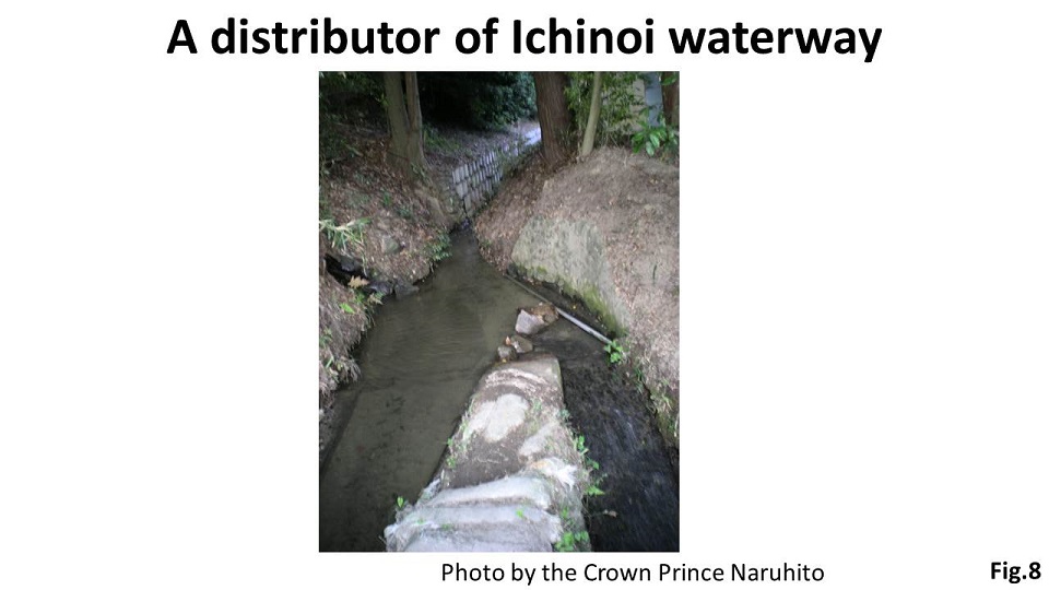 Kiinokuni was ruled by the regional government of Kishu in the early 18th Century. The Government of Kishu built the Odai Waterway running through the Kaseda Area. The Odai Project enabled the irrigation of an area as large as 1,000 hectares by drawing water from the Kinokawa River, the main river. The central government was impressed by this “water success.” When I visited the Tone River in 2009, I learned that the Shogun Yoshimune Tokugawa summoned to the capital the chief engineer of the Odai Project, Yasobei Izawa. Izawa employed the most advanced technology at that time, such as instrumental surveys and syphon works, to build the Minumadai Waterway near Tokyo. The waterway, as long as 60 kilometers, enabled irrigation of 15,000 hectares, an area 15 times larger than the Odai (Fig.9). This experience and technology spread all around the Kanto area, which created the foundation of agricultural development in pre-modern Japan.