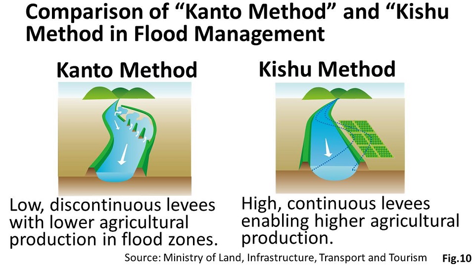 The knowledge and technology transferred from the Kishu Area was called the “Kishu Method” in comparison with the “Kanto Method” which had been used in the capital area (Fig.10). According to the “Kanto Method,” low levees were built to contain small floods in the water course whereas they let larger floods flow to the hinterlands. According to the “Kishu Method,” continuous high levees maintained a high flood water in the water course, which enabled much higher agricultural productivity in larger areas behind the levees.
