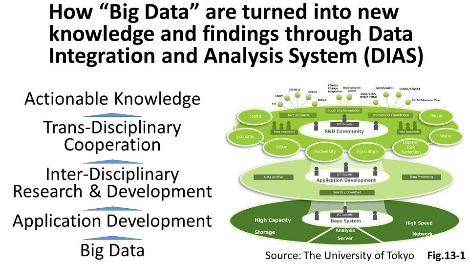 Massive data on water, atmosphere, lands and oceans are collected, integrated and put into archives in the Data Integrated Analysis System (DIAS). The data are effectively managed and used in the areas of disaster reduction, agriculture, climate, environment and so forth (Fig.13-1, 13-2). For example, researchers using DIAS found that an increased atmospheric temperature above the Himalayas will cause climatic disturbances in East Asia. The Integrated Flood Analysis System (IFAS) can give satellite-based flood forecasts and early warnings in remote areas and developing countries where ground-based rain data are not available (Fig.14).