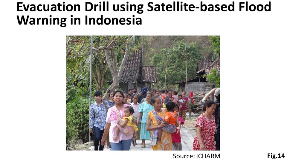 Human life comes first when addressing the challenges of water and disasters. It is critical to save people’s lives from disasters through timely forecasts and early warnings. I would like to draw your attention to disaster reduction methods by satellite and information technology. The Global Earth Observation System of Systems (GEOSS) in this figure (Fig.12) is a global collaborative initiative to observe the earth from the sky and the land.