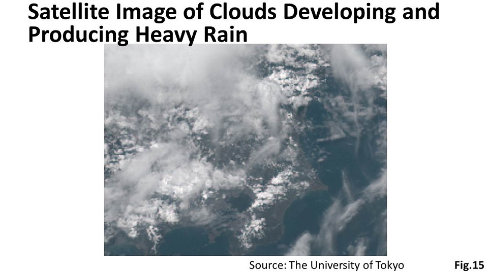 It is also important for people to understand the meaning of disaster information they receive, and to take adequate measures such as prompt evacuations. This video (Fig.15) shows how heavy-rain clouds developed over Japan this year in the summer. From motion pictures like these, one can help citizens intuitively to understand the mechanisms of disasters.