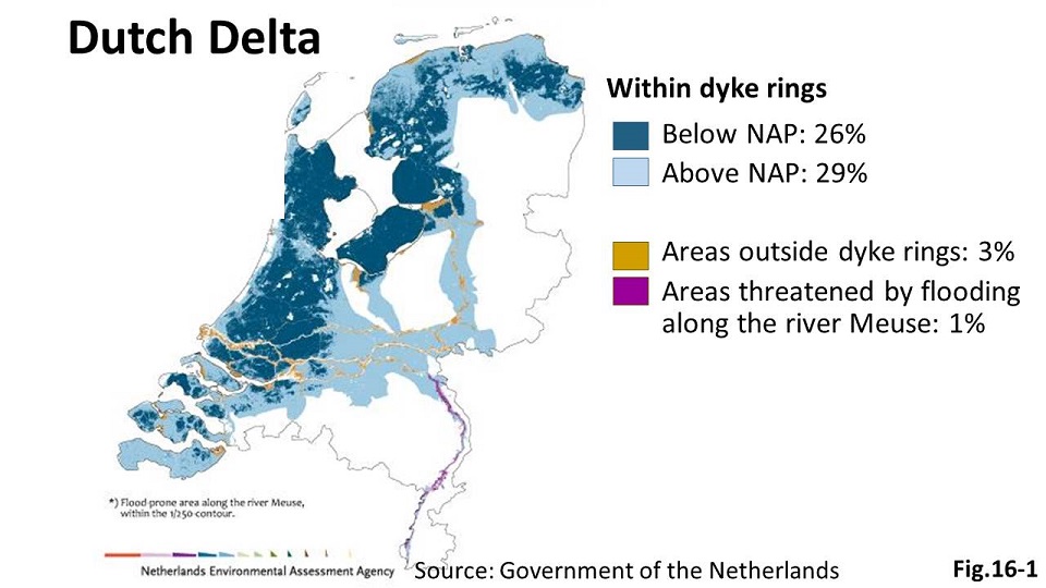 Building a disaster-resilient society comes next. For example, the new Delta Plan was established in the Netherlands, where 26 percent of the land area is below the sea water level (Fig.16-1, 16-2). The plan assumes that the sea water level will rise by 0.65 meters to 1.3 meters in 100 years. Multiple measures will be taken to assure that the citizens are safe against floods that may occur once in 100,000 years. This plan reinforces a previous one that presumes those in 10,000 years.