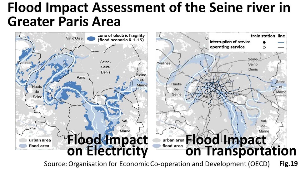 The United States has strengthened national disaster preparedness taking into consideration the experience and lessons of Hurricane Katrina in 2005. The flood damage was significantly reduced in Hurricane Isaac and Hurricane Sandy in 2012 thanks to enhanced preparedness (Fig.17). A dual-purpose tunnel for flood drainage and car transportation was constructed in Kuala Lumpur in Malaysia (Fig.18). It helps to manage both flooding and traffic jams in the capital. France, in collaboration with the OECD, has conducted a full-scale flood impact analysis of the Seine River in the Greater Paris Area and has proposed comprehensive flood mitigation measures (Fig.19).