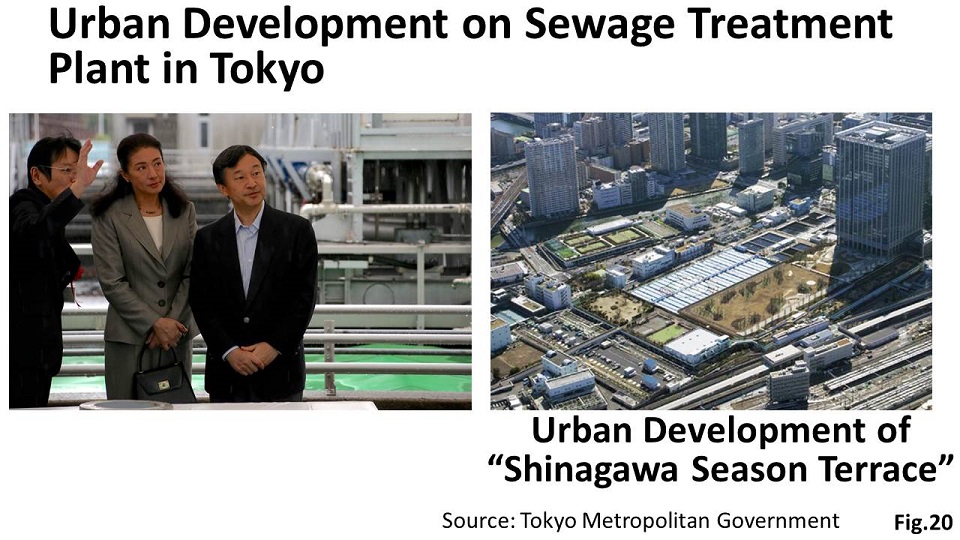 Various efforts to improve water environment and flood preparedness are underway in Japan. This picture (Fig.20) shows an urban complex in Tokyo which I recently visited. A large-scale sewage treatment plant under the building harnesses rain storage and a biogas power plant (Fig.21). This complex recycles water and energy and reduces flooding. At the national level, climate change adaptation measures that employ both structural and non-structural measures are underway.