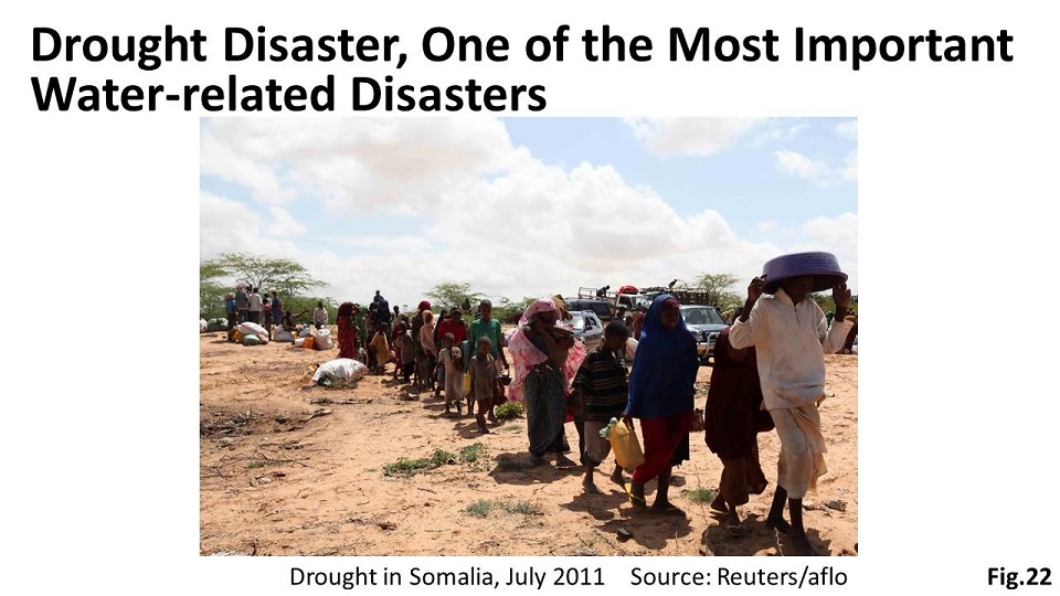 Drought is one of the most important water-related disasters (Fig.22). The number of occurrences of drought in the last 20 years is just 5% of a total number of disasters. However, the number of affected people by drought in the same period reaches 1.1 billion that accounts for 25% of the total. 41% of drought occurs in Africa, 25% in the Americas, and 24% in Asia.