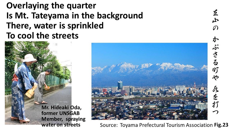 The poem reminds me of a town of Toyama where majestic Mt. Tateyama stands in the background, overlaying the town. People sprinkle water to enjoy cooled streets in the summer. Water benefits us in many ways. Mountain streams are turned into water for drinking and agriculture. Shortage or excess of water, on the other hand, has a negative impact on people and their lives. I will continue my efforts to bring about a world where people can live peacefully and happily as depicted in this poem.