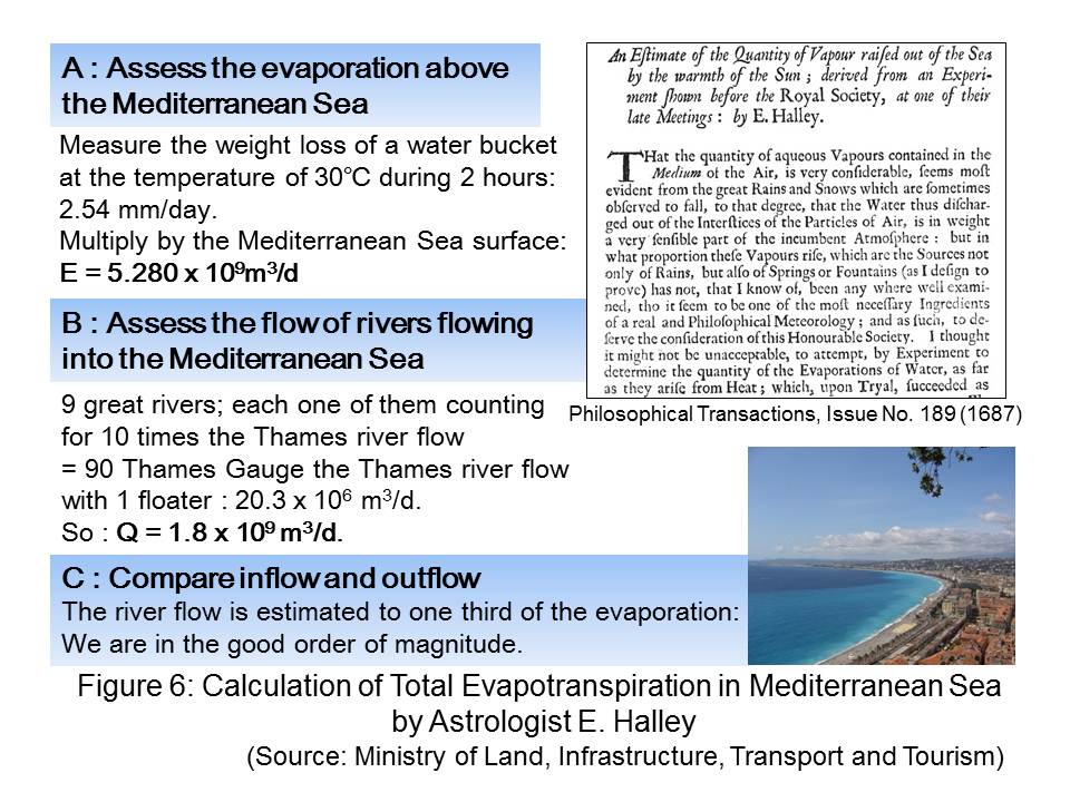 As an example of relations between science and technology and water, I would like to speak about the water cycle. The concept of water cycle had already been developed by the philosopher Aristotle as early as the 4th Century BC when he was seeking for laws of nature on the earth and the ocean in his work titled “Meteorologica”. In Iran, a practical technology for the water cycle called “Qanat” (Fig.5) was developed in the 8th Century BC. “Qanat” is a system consisting of underground water tunnels through which groundwater is efficiently extracted and conveyed. This technology was developed in dry regions where much water is lost through evaporation. When I visited Oman in 1994, I saw “Falaj”, a similar irrigation system utilizing under-ground channels. The system has been used for centuries. Modern science on the water cycle was developed later by E. Halley (Fig.6), an astronomer whose name is recalled with “Halley’s Comet”. He calculated total evaporation from the Mediterranean Sea and concluded that it is greater than the total discharge into the sea. These examples show that the science and technology of water have been intertwined with various academic areas depending on the needs and interests that vary through space and time.