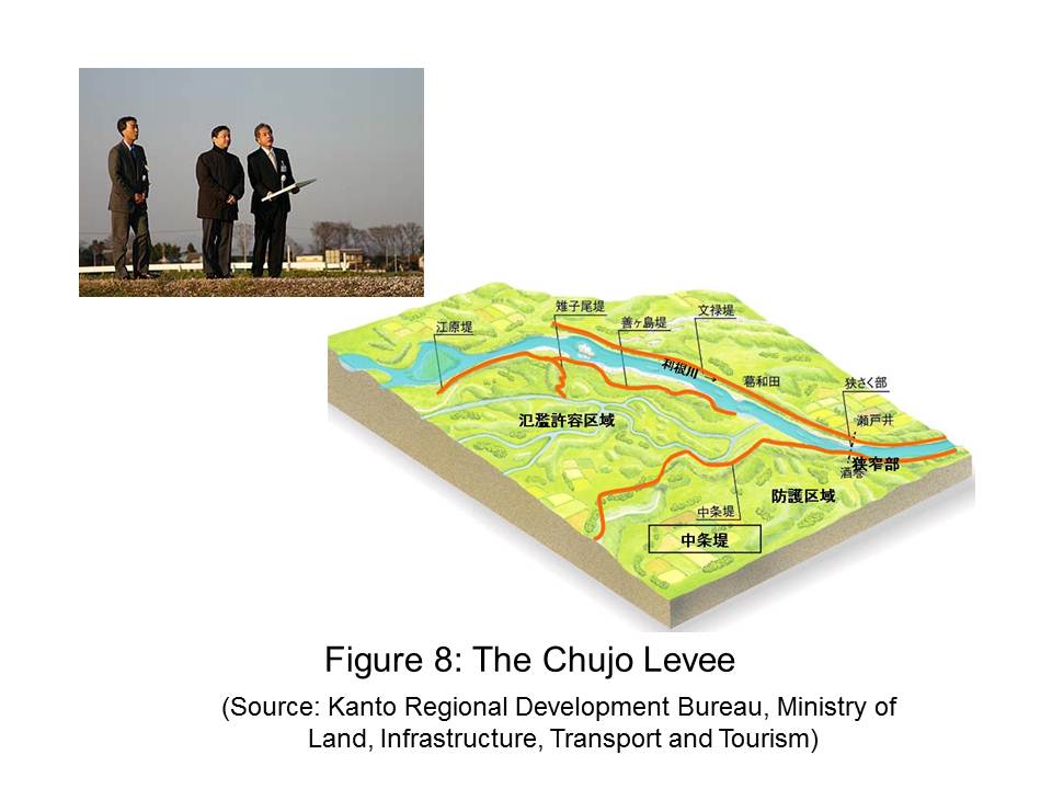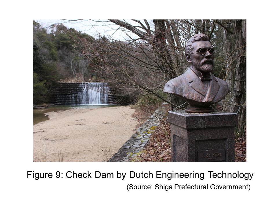 The same applies in the area of water and disasters. Networks of moats were found in the ruins of the Kango settlement (Fig.7) from Japan’s Yayoi Period around the beginning of the present era. This means that technologies to discharge water and manage flood had been developed in ancient Japan. The Chujo Levee (Fig.8) was constructed in the Edo Period off the main river course of the Tone River, which I visited, to prevent intrusion of flood water into the capital area of Edo, now Tokyo. Further along in history, the government of Japan adopted modern flood management technology from the Netherlands (Fig.9). An example is the separation work of the three large braided rivers of Kiso for flood control in the Meiji Era. The construction work was based on a plan developed by the Dutch engineer Johannis de Rijke. These examples indicate that the desire for a better and safer life propelled the development of science and technology for water-related disaster risk reduction.