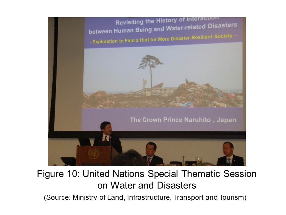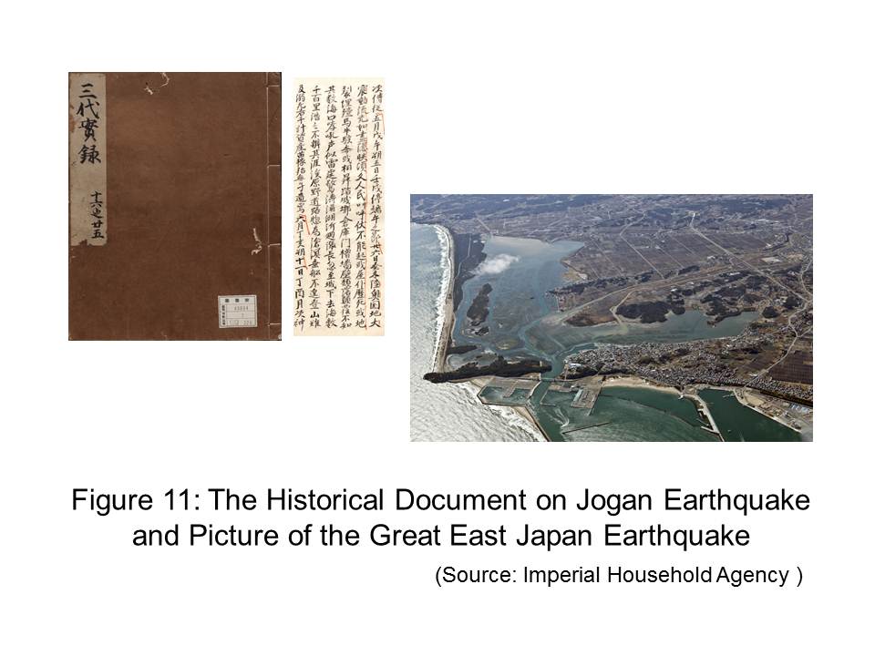 I have talked about the history of the development of science and technology concerning water. Now I would like to talk about examples in which the historical record itself has contributed to the development of science and technology. In 2013, I gave the key-note lecture in the Special Session on Water and Disasters organized by His Excellency Mr. Ban Ki-moon, Secretary-General of the United Nations (Fig.10). In the lecture, I touched upon old historical records of water-related disasters, and showed that the occurrence of a large-scale tsunami due to the Jogan Earthquake in 869, more than one thousand years ago was confirmed by geological research works conducted on the basis of historical documents on the ancient tsunami (Fig.11). The research confirmed that the Great East Japan Earthquake of 2011, although a rare event, was not the only mega-tsunami of that scale in the history of the affected region. This fact may provide precise clues for advancing tsunami disaster risk reduction measures in the future. You may discover a path for scientific development and a better future for water and people by analyzing chronological records of disasters in the past.