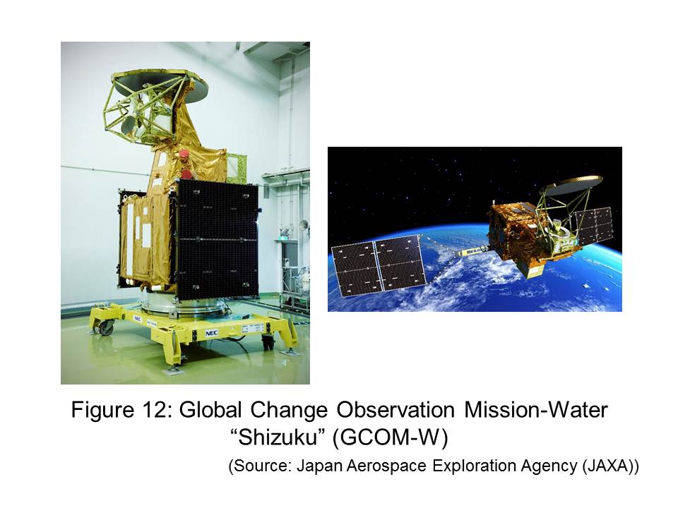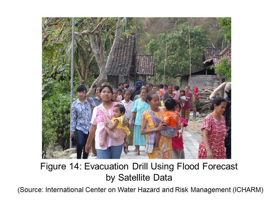 When I went on a tour with the Prince of Orange, now His Majesty Willem-Alexander of the Netherlands, to the Japan Aerospace Agency (JAXA) in Tsukuba City in September 2010, I learned that space technology has been extensively used to observe water on the earth. I saw a Flight Model named “Shizuku” (Fig.12) that was waiting for launch. Shizuku, meaning a “water drop”, is now successfully orbiting the earth, informing us of the global status of water, such as vapor, clouds and precipitation. The data of Shizuku and other satellites (Fig.13) enable flood forecasting in remote areas and developing countries where observation data had been unavailable. The people of these areas can now be prepared and take action before a disaster happens (Fig.14). The desire to protect people and their family from threats of flooding in even local, deprived areas has been fulfilled today by the use of quintessential technology.