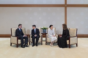 An audience is a meeting of Their Majesties the Emperor and Empress with foreign Heads of State, Prime Ministers, Ambassadors and their spouses, and other distinguished guests. On such occasions Their Majesties have friendly conversations with these guests. Their Imperial Highnesses the Crown Prince and Crown Princess and other members of the Imperial Family also hold friendly meetings with foreign guests. |