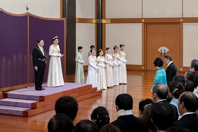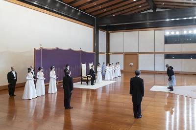 At the Imperial Palace each year on January 1, Their Majesties the Emperor and Empress receive New Year greetings from His Imperial Highness the Crown Prince and other members of the Imperial Family; the Speaker and Vice-Speaker of the House of Representatives and the President and Vice-President of the House of Councillors; Diet members; the Prime Minister; Ministers of State; the Chief Justice and Justices of the Supreme Court; other government officials with Imperial attestation (Ninshokan); Administrative Vice-Ministers of Ministries and Agencies and other leading figures of legislative, executive and judicial organs; prefectural governors and chairpersons of prefectural assemblies; and heads of diplomatic missions to Japan and their spouses. This ceremony is considered a state event. |