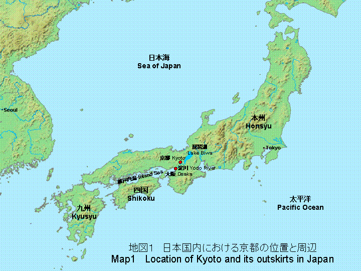 京都は内陸部の都市ですから,日本に於ける水運の要だったといえば,不思議に思われるかもしれません。まず,(地図1)により,京都の地理的な位置を,水運という観点から確認したいと思います。