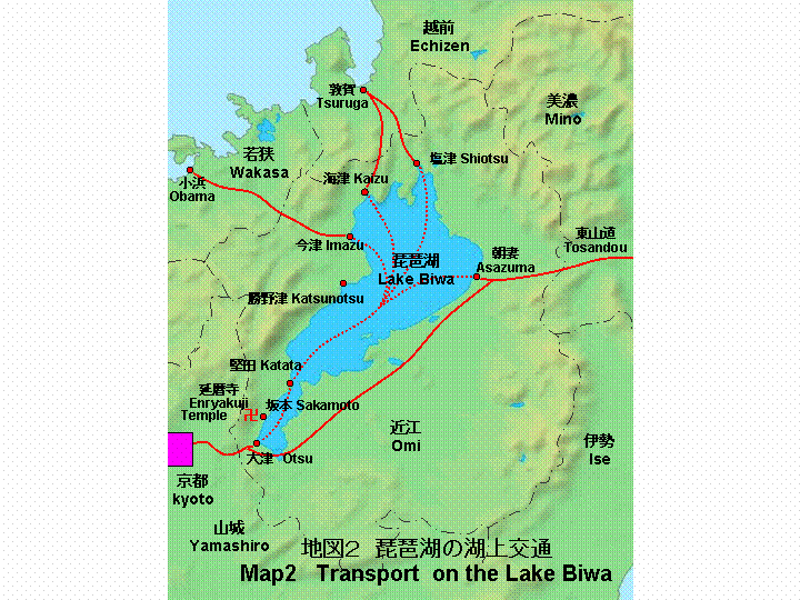 日本海側の越後,能登,加賀,越前(今でいう新潟県,石川県,福井県にあたります)からの荘園年貢は,海路敦賀または小浜へ輸送されまして(地図2をご覧下さい),今度は琵琶湖の北の塩津・海津・今津などの港に陸送され,琵琶湖を船で大津,坂本に着け,更に馬や車で京都に運んだと言われています。なお,当時の車は,牛や人が引いたものが多く,日本に馬車が導入されるのは都が東京にうつる19世紀半ば過ぎの明治時代になってからでありました。