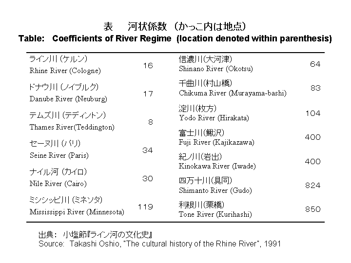 まず(表)をご覧下さい。これは,河状係数により,世界の川と日本の主要河川とを比較したものです。