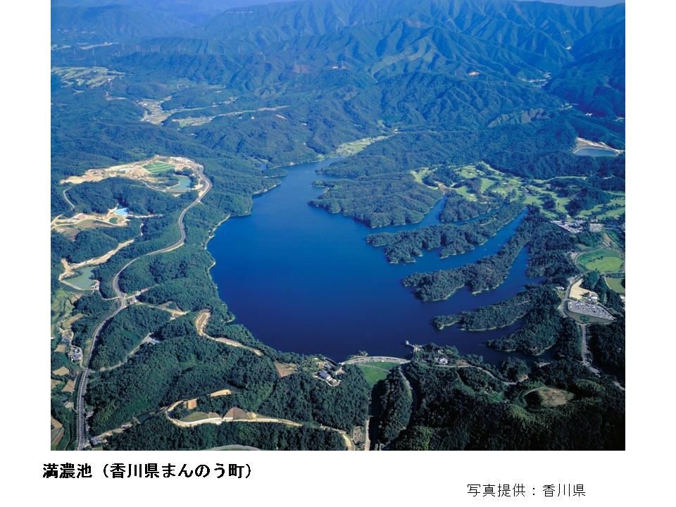 次に,この図をご覧ください(図9)。これは瀬戸内地方のため池の分布状況です。瀬戸内地方には,日本のため池の約60%が集中しています。この写真は,弘法大師空海も修築に携わったことが伝えられる讃岐平野の満濃池です(図10)。8世紀初頭とされる築造以来,何度もの修築を繰り返しながら,現在も水の確保に苦しむ讃岐平野の貴重な水源となっています。