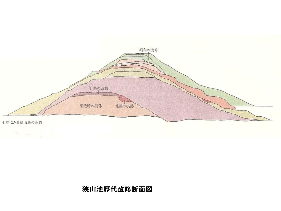 こちらは,ほぼ同時代に行基僧正が造ったと言われてきた大阪の狭山池です(図11)。この池も今なお現役として使われているもので,最近では1980年から2001年にかけて,約20年にわたる修築工事が行われました。その際の発掘調査で,最初の堤の築造が少なくとも616年にまで遡ることが確認されました。行基の時代より100年以上も前のことになります。その後,堤が何度も嵩上げ(かさあげ)されて現在の姿になった様子が明らかとなりました(図12)。行基もそのいずれかの修築にかかわったものと考えられています。