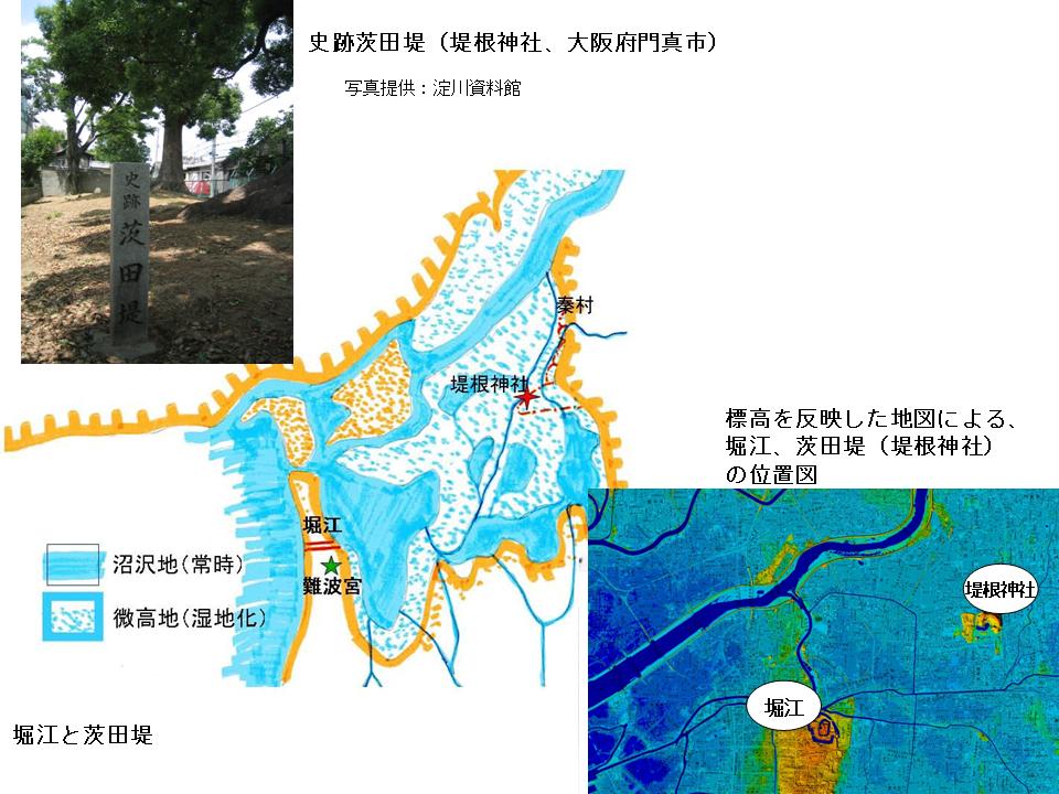 このことについての最も古い日本の歴史における記述は,8世紀の『日本書紀』に見られます。そこでは,仁徳天皇の時代に,淀川の氾濫を防いで大阪平野北部を開発するために堀江を掘り,茨田堤(まんだのつつみ)を築いたと記されています(図13)。古代の治水や利水に関する研究を踏まえると,5世紀初頭にはこれらの土木事業が行われたと考えることもできそうです。現在でも堀江は旧淀川(大川)として大阪の中心部を流れ,茨田堤と伝えられる堤も大阪市近郊の寝屋川市や門真市付近にその姿を残しています。放水路と築堤という全く異なった事業,それも10キロメートルも離れた二つの大事業を同時に実施した先人たちの構想力の大きさに驚かされます。