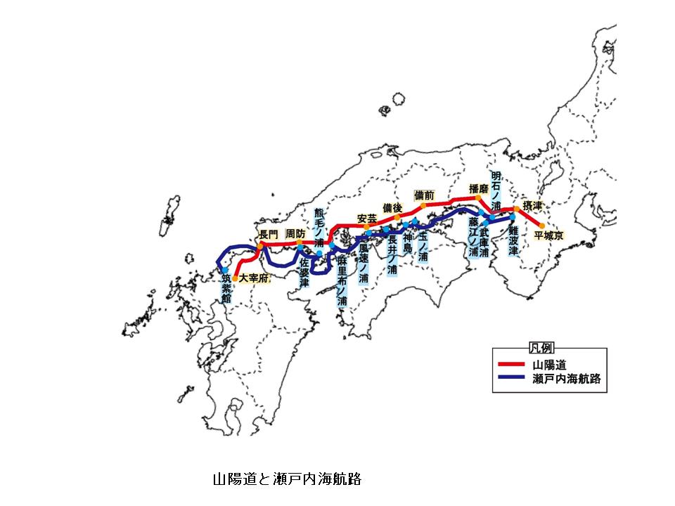 今日と明日,このサミットが開催される大分は,北部九州に属しています。古代から中世にかけては,都の置かれた畿内(現在の近畿地方)と北部九州が日本の二大拠点でした。陸路ではその間を山陽道が結んでいましたが(図2),畿内から全国へ延びる七道のうち,この山陽道とそこから続く大宰府までの道だけが唯一「大路」と定められていたのです。大宰府は,北部九州の行政府であるばかりでなく,外交上,対外軍事上の拠点でもありました。大和朝廷は,常に大宰府の重要性を意識していたのです。