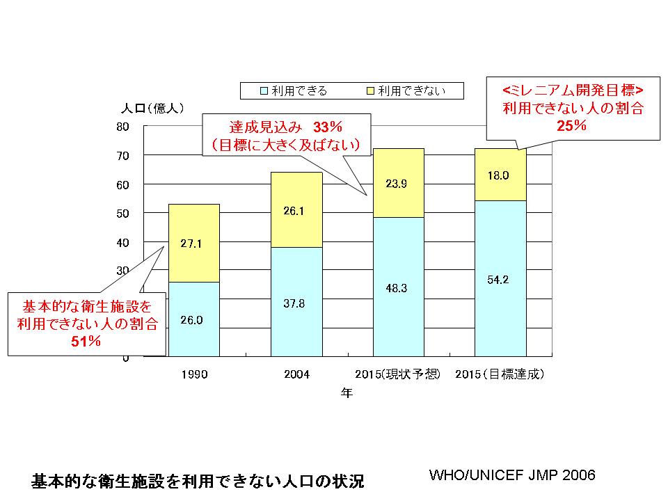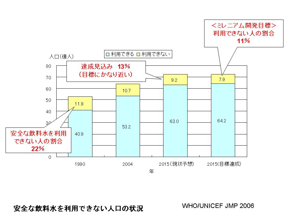国際社会が2015年までに達成すべき8つの目標を掲げた「ミレニアム開発目標」を見ると,そのすべてに水問題が深くかかわっていると言っても過言ではありません。例えば,女性の地位向上や初等教育の完全普及といった目標の達成のためには,女性や子どもたちを水くみ労働から解放し,また,コレラや腸チフスなど非衛生的な水に起因する病気を減らしていかなければなりません。水にかかわる病気のために約10秒から20秒に一人,子どもの命が失われているという事実には胸が痛みます。