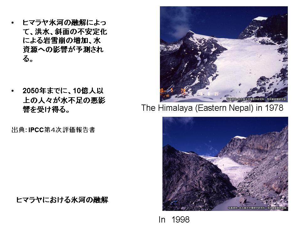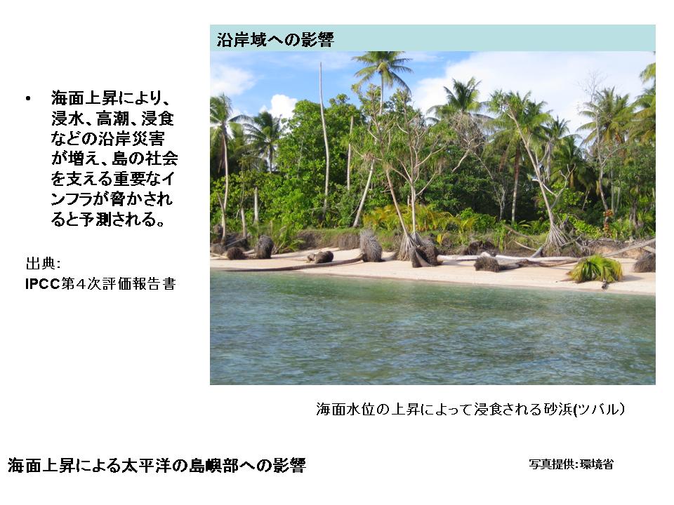今年公表されたIPCCの第4次評価報告書においても,ヒマラヤ山脈の氷河の融解による洪水や雪崩の増加など,アジア太平洋地域への深刻な影響が予測されています(図21)。また,この場にも多くの太平洋地域の首脳がお集まりですが,特に島嶼部では,海面上昇による浸水,高潮,侵食などの沿岸災害の増加と利用可能な淡水量の減少が強く懸念されているところです(図22)。いずれも,このサミットでの重要な検討テーマだと伺っており,その解決に向けて建設的な議論が行われることを期待しております。