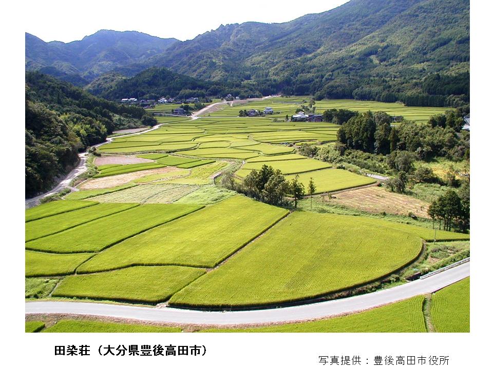 まず「足りない水」について見てみましょう。これは,かつて宇佐神宮の重要な荘園であった田染荘(たしぶのしょう)の田園風景です(図7)。この水田地帯は,何世代にもわたる人々の努力によって造られたものなのです。雨引神社(あまびきじんじゃ)の湧き水を地形を利用しながら緩やかな曲線を描いて導水し,上の田から下の田へと行き渡らせています。その結果生まれたのがこの棚田です。この美しい景色は長年にわたる人々の知恵と汗の結晶とも言えるでしょう。