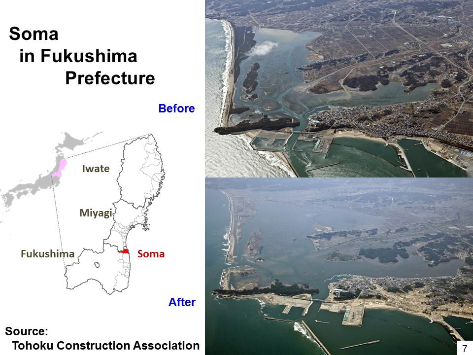 今日から5日後に発災から2周年を迎えようとしています。この写真は私が災害から5ヶ月後に現地の仮設住宅を訪れた際のものです(図6)。未だに31万5千人の人々が故郷を遠く離れて暮らしているというように極めて厳しい状況が現在も続いております。他方,現在でも約2,700人に及ぶ行方不明者の捜索という地道な作業に加え,集団移転地の確保など復興にむけての取り組みも進められております。復興計画の策定に際しては,高地への移転という安全性と海岸への容易なアクセスという利便性の調整といった各地共通の課題に苦心しながらも,地域の特性に応じた最適案を求めて懸命の努力が続けられております。