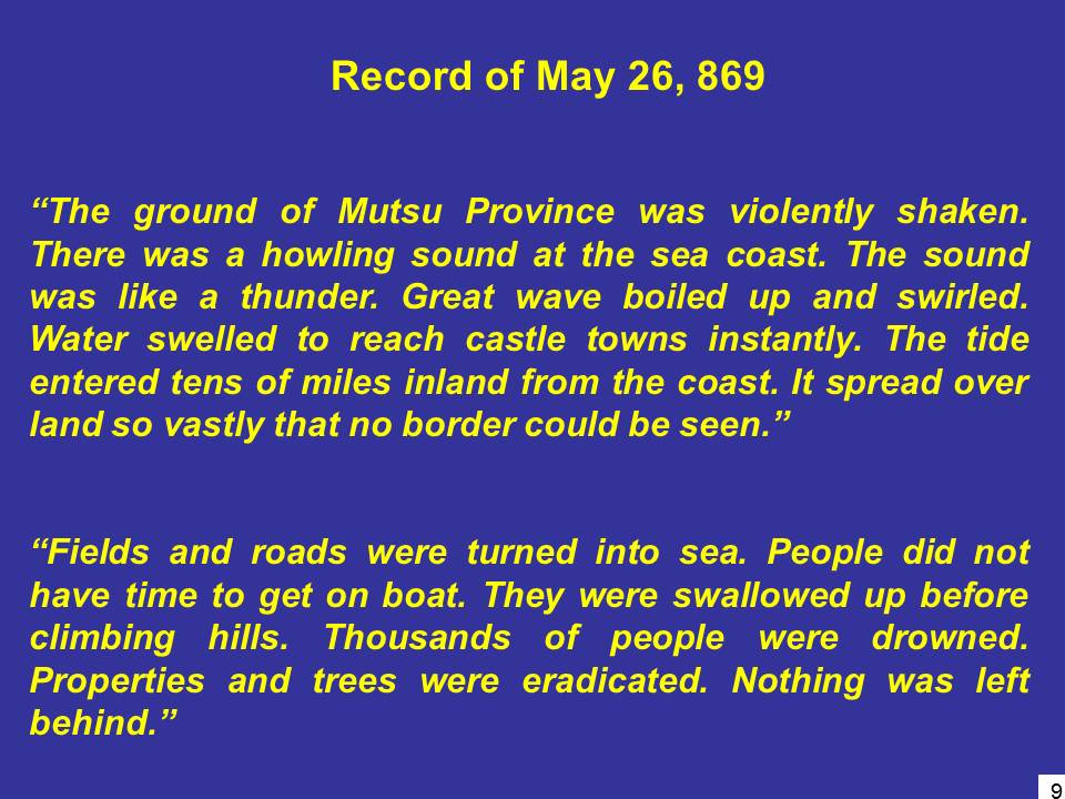 ご覧いただくように(図9),日本三代実録が伝える記述は,1100年以上も前の災害というのに,地震動から始まり,海面の急上昇,うずの発生,急速な内陸部への侵入,被害の状況などを的確に伝えており,津波災害の実態を正確に言い表しているのに驚かされます。