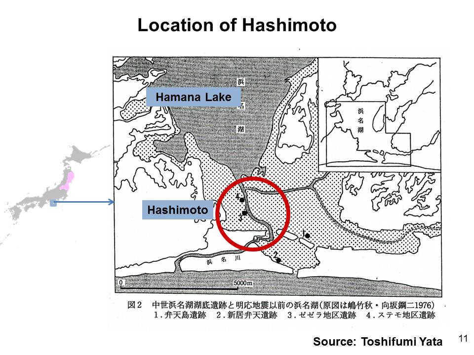 明応7年の津波(1498年)は伊勢及び浜名湖地域にも大きな被害をもたらしました(図10)。浜名湖と太平洋を結んでいた浜名川に架けられた橋の周りは,交通要衝の宿・橋本として大いに栄えていましたが,この地震津波によって壊滅的な被害を受けました(図11)。そしてこの地震後,浜名湖は海側が大きく切り込まれ塩水が侵入しました。湊は今切・新居に場所を移して復興したものの,往時の賑わいは取り戻せなかったようです。