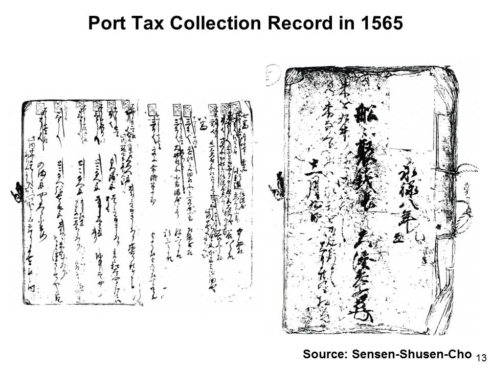 この伊勢・大湊に関する徴税史料『船々聚銭帳』(図13)によれば,永禄八年(1565年)十一月十日から翌年の六月までに約120艘の回船が大湊に入港しており,その一部は遠江にまで到達しています。
