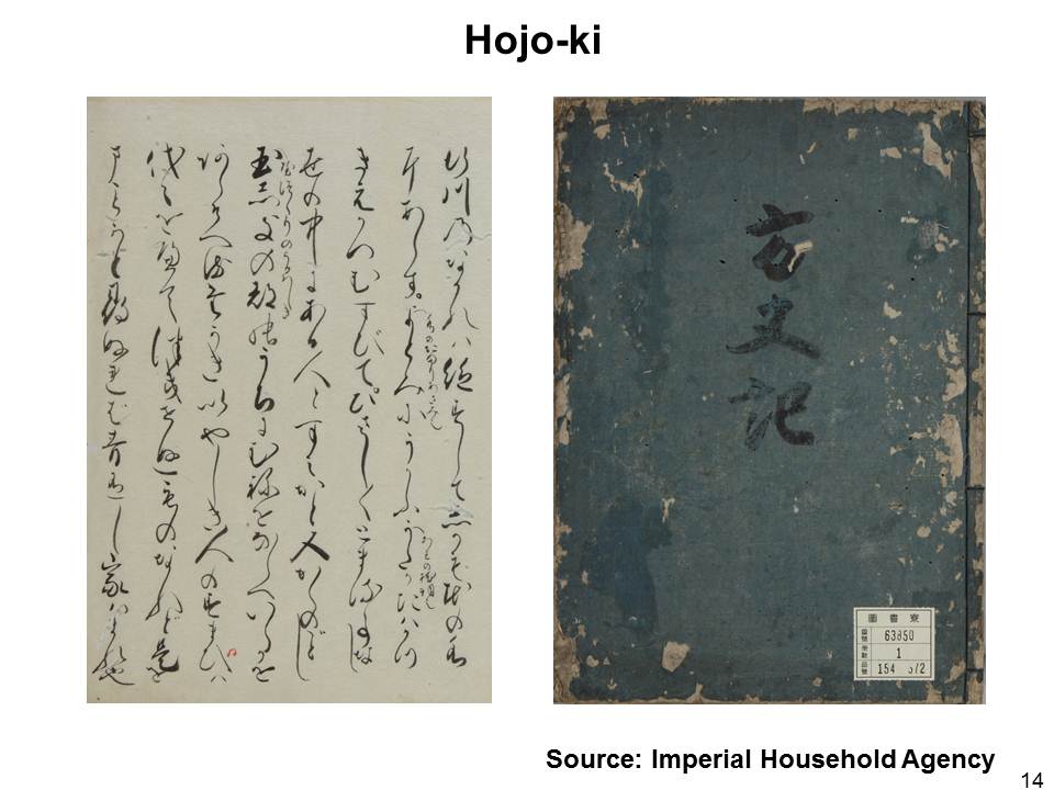 災害を記録することとなると神官で,世に知られた歌人・随筆家でもある鴨長明の『方丈記』が思い出されます(図14)。昨年が執筆されてから丁度800年の節目の年に当たりました。