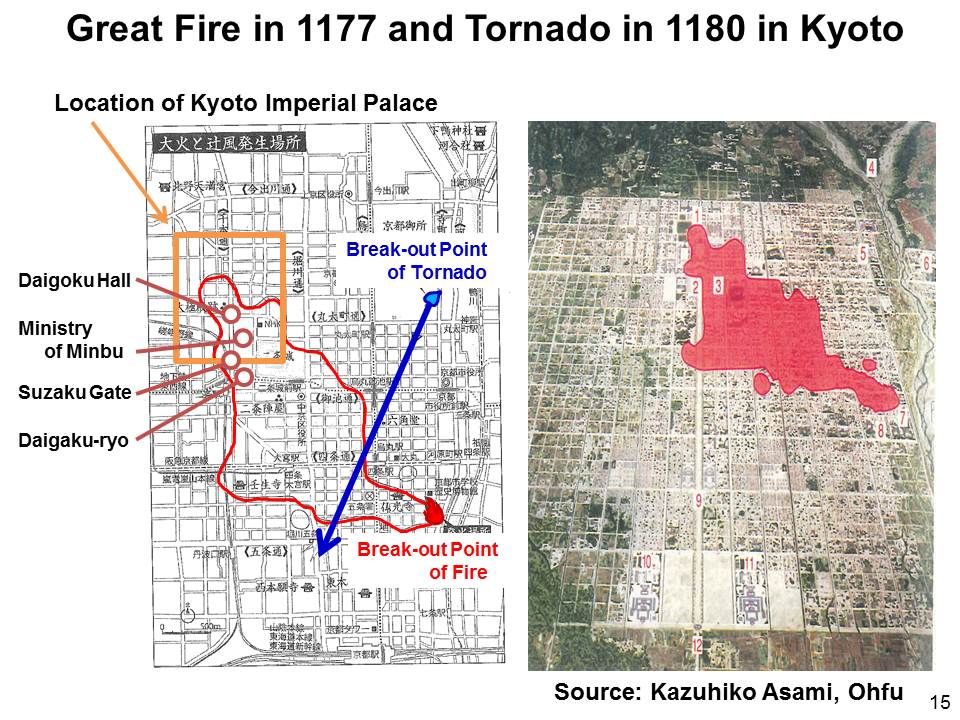安元の大火(1177)では,当時の都である平安京(京都)左京の三分の一が烈風に煽られた火災で一夜のうちに塵灰に帰した様子が生々しく描写されております(図15)。その一節を見てみましょう「安元三年(一一七七)四月二十八日のことだったかと思う。…都の東南の方から火が出て,西北の方に向かって広がっていった。しまいには朱雀門,大極殿,大学寮,民部省などにまで火が燃え移り,一夜のうちにすべてが灰となってしまった。…末広の形となっていった。遠い所の家は煙にむせび苦しみ,火に近いあたりでは,炎は激しく地面にふきつけている。空へは灰を吹き上げているので,火の光を反射して,あたり一面,紅色にそまっている。風に押されて,吹きちぎられた炎は,飛んでいくかのように,一,二町の町を飛び越え,飛び越えしながら移ってゆく。」