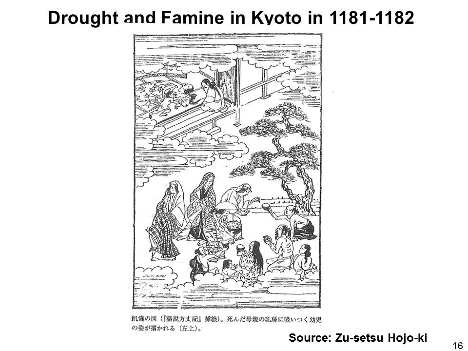 養和の飢渇(1181~1182)がさらに追い打ちをかけました。春・夏のひでりと秋の大風・洪水が繰り返して襲い深刻な被害を生みました。まさに水災害,それも対照的な旱害と水害が打ち続いたわけで,「稲や麦などの五穀はすべて実らない。…諸国の民は…ある者は我が家のことを忘れて,山に住む。さまざまのお祈りが始まり,特別な修法なども行われるのであるが,全くその効果はない。…たまたま交換する者は金を軽く扱い,粟を重く扱う。乞食は道路のはしに大勢集まり,憂え悲しむ声は耳にあふれる」