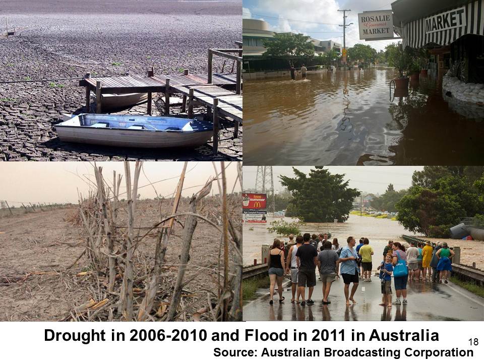 またオーストラリアでは2006年から2010年にかけてクイーンズランド州で厳しい渇水が続きましたが,10年末から11年にかけて同州で発生した洪水は渇水を収束させる一方で大きな水害被害を引き起こしました(図18)。サブサハラアフリカでは2010年以降渇水による飢饉が発生する一方で洪水も各国で頻発しています(図19)。